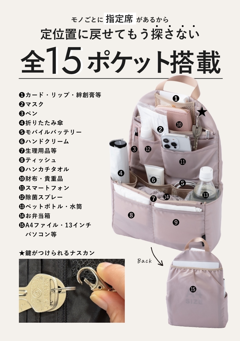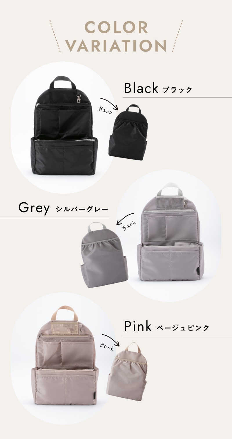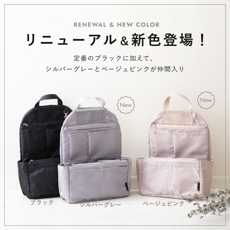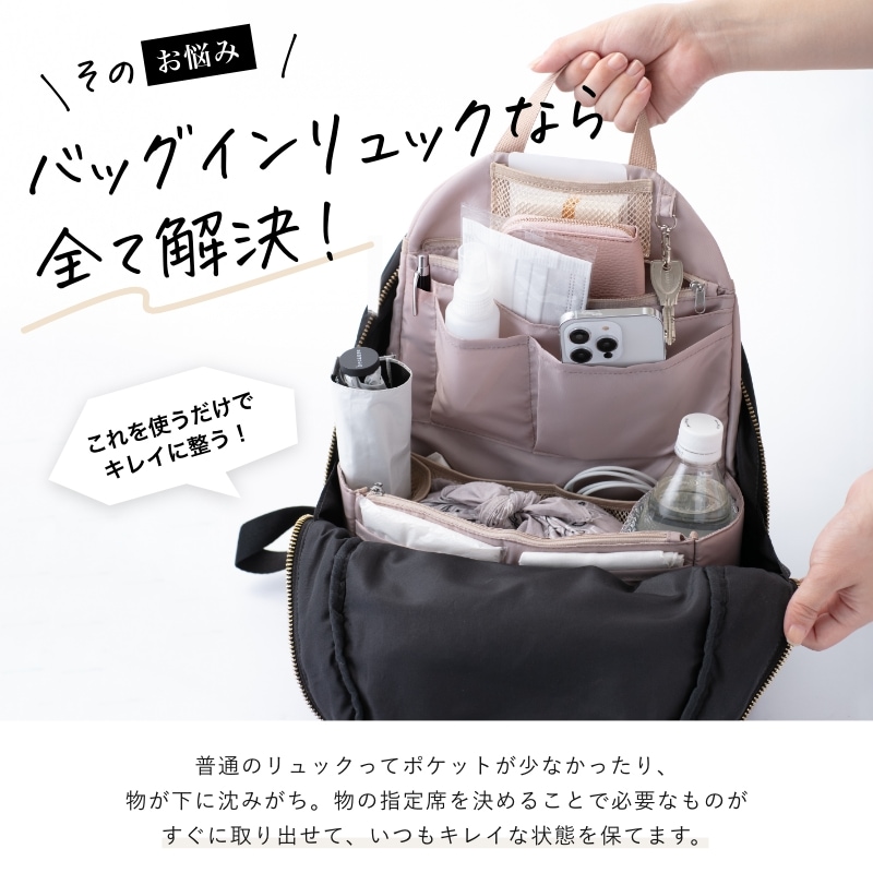ごちゃごちゃしがちなリュックの中が綺麗にスマートに!どんなリュックにも使える"リュック用バッグインバッグ"です。A4ファイルが折れ曲がらずに収納できるので、教科書やノート、ビジネス用途、通勤・通学にも最適!