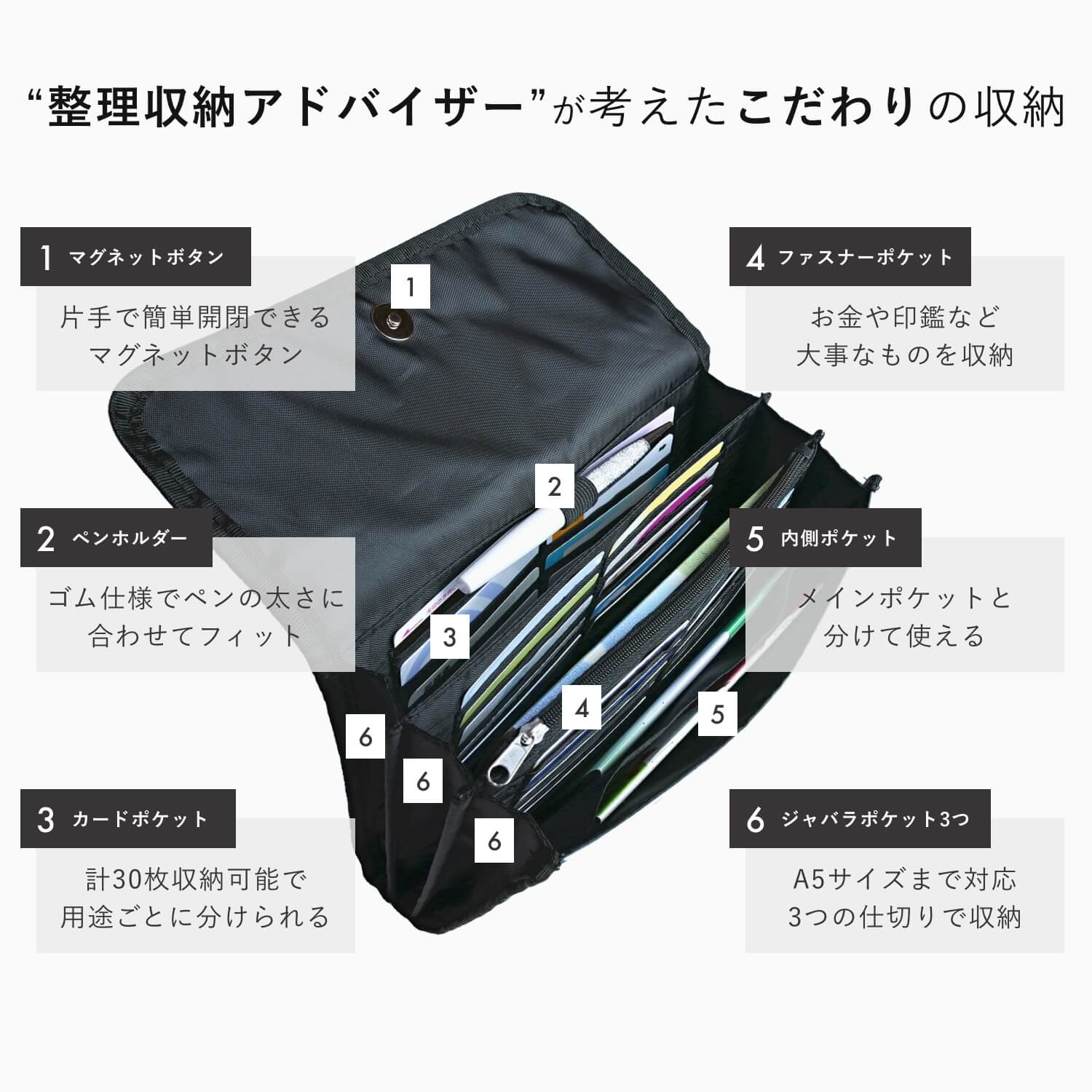 Point(6)ガバッと開く『ジャバラ式』、A5サイズまで入る3つのポケットで『家族3人分の収納力』